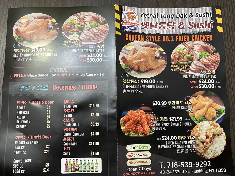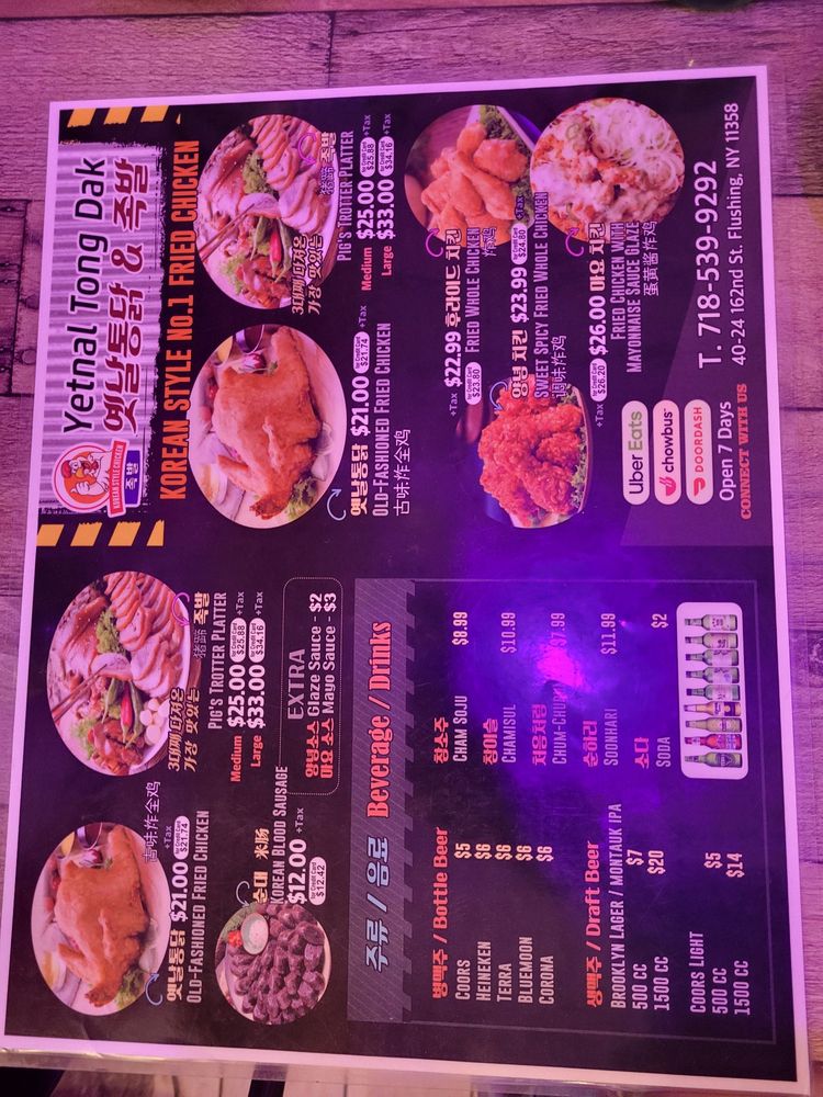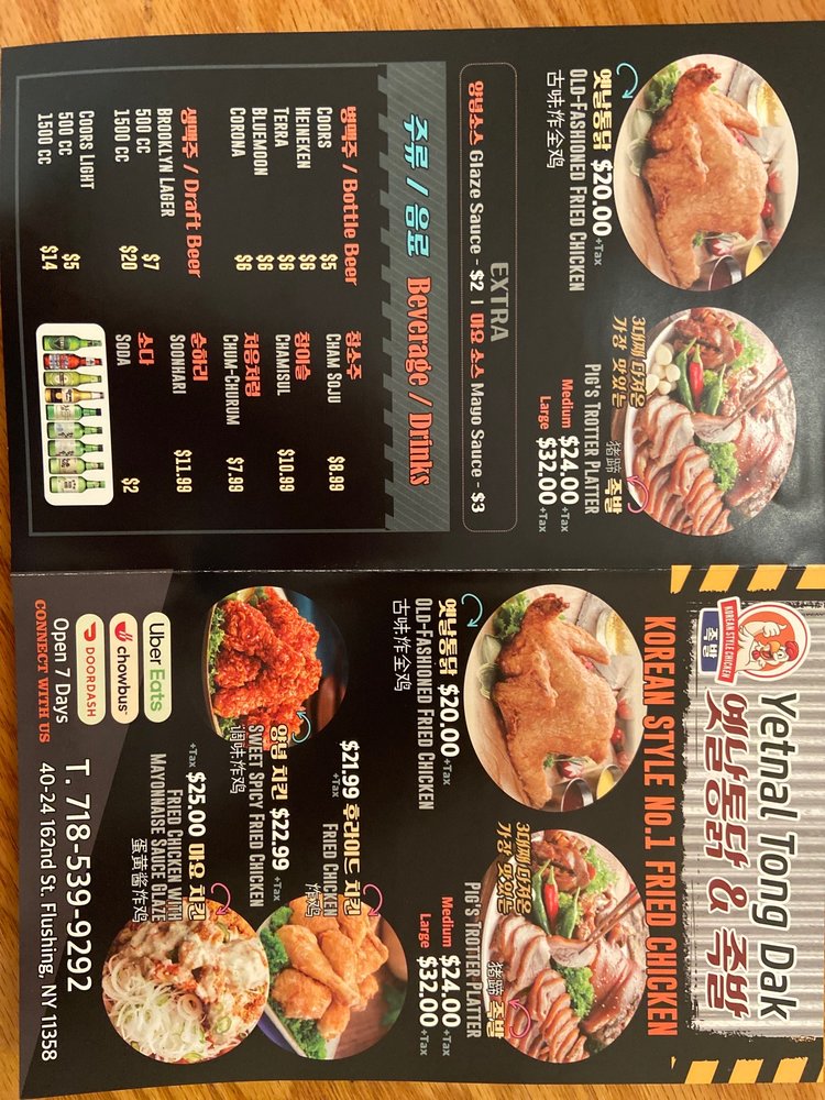 Welcome to Yetnal Tongdak, your go-to destination for authentic Korean fried chicken in Flushing, NY. Known for its crispy exterior and juicy meat, Yetnal Tongdak features an extensive menu that showcases a variety of flavors such as BBQ with Honey Sauce, Soy Garlic, and Sweet & Spicy, all available in chicken wings and whole chickens.
